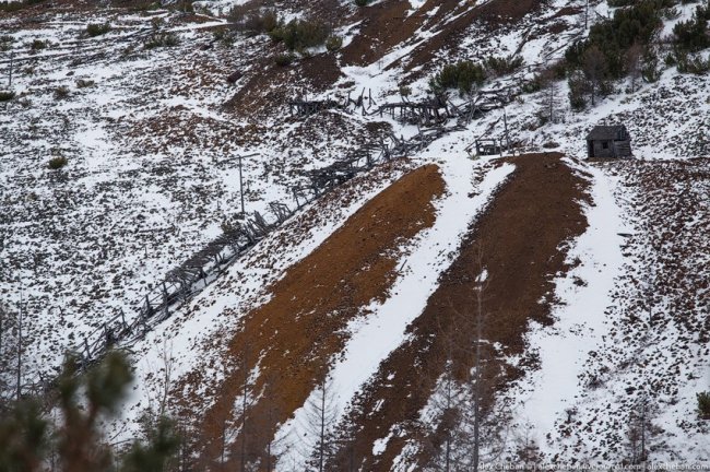 В 50е годы механизация труда уже была на достаточно высоком уровне. Это остатки железной дороги, по которой руда на вагонетках опускалась вниз с сопки. Конструкция называется «Бремсберг»: