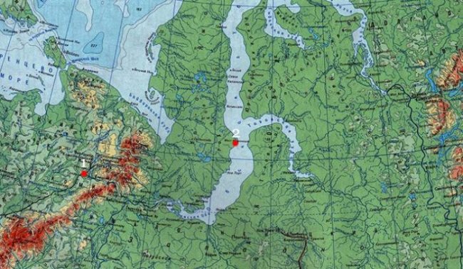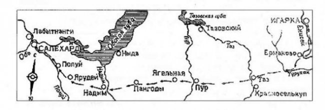 За достоверность цитаты ручаться сложно, однако фактом остается постановление Совета министров СССР от 22 апреля 1947 года. Согласно документу, в Обской губе (залив Карского моря, в который впадает Обь) в районе мыса Каменный должен был быть построен новый крупный морской порт с жилым поселком, а от станции Чум на Печорской магистрали (южнее Воркуты) к ним проложена железная дорога протяженностью в 500 километров. На фрагменте карты красной точкой №1 отмечена начальная точка перспективной магистрали, а точкой №2 — мыс Каменный.