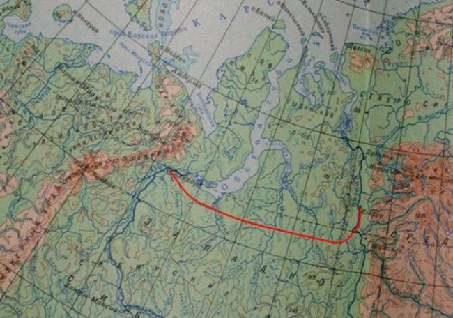 Вместо относительно скромной 500-километровой дороги Чум — мыс Каменный родился грандиозный замысел строительства действительной Великого Северного пути Чум — Салехард — Игарка общей протяженностью 1482 километра, из которых 1286 еще только предстояло возвести. Дорога на карте России обозначена красной линией (по клику открывается изображение большего размера).