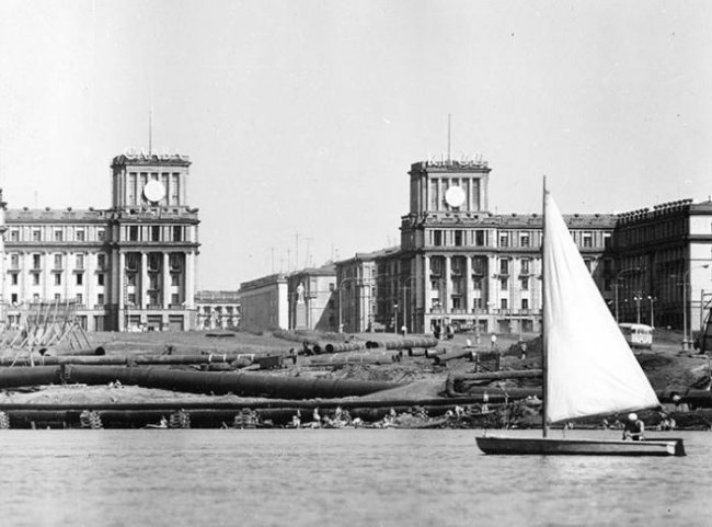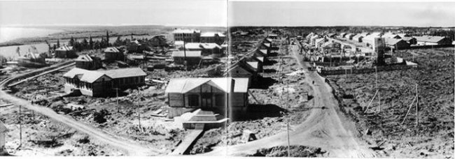 Итак, с апреля 1947-го по декабрь 1948-го в эксплуатацию была сдана 196-километровая трасса Чум — Лабытнанги. Было совершенно непонятно, что делать дальше, учитывая бесперспективность прежнего северного «обского» направления. 29 января 1949 года после совещания Сталина, Берии и руководителя ГУЛЖДС «Нафталия» Френкеля вышло еще одно постановление Совета министров СССР, в котором определялось новое место для возведения все той же «крупной промежуточной базы морских коммуникаций». Ее было решено перенести в район города Игарка Туруханского района Красноярского края, то есть более чем на тысячу километров восточнее, на правый берег Енисея, где морской порт функционировал с конца 1920-х годов. Так этот заполярный город выглядел в начале 1950-х, в это время здесь жило около 20 тыс. человек.