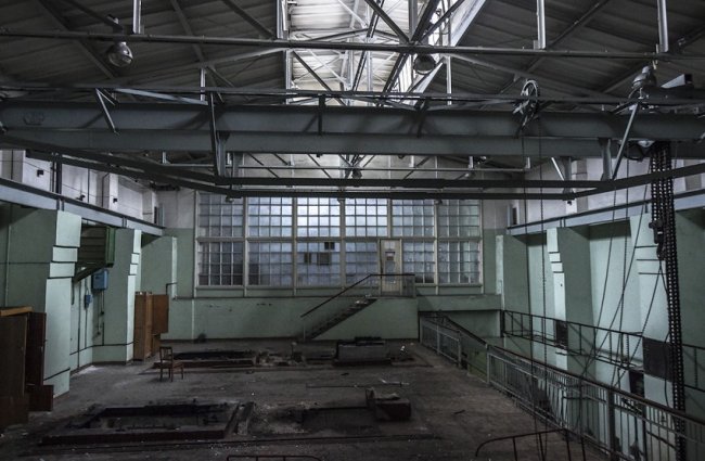 А вот зал бывшего стенда по исследованию сверхзвуковых воздухозаборников СВ-1. Ворота к другим стендам закрыты на замки, но большая часть из них пребывает в таком же состоянии.