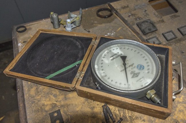 На столе в красивой коробочке лежит образцовый манометр выпуска 1961 года.