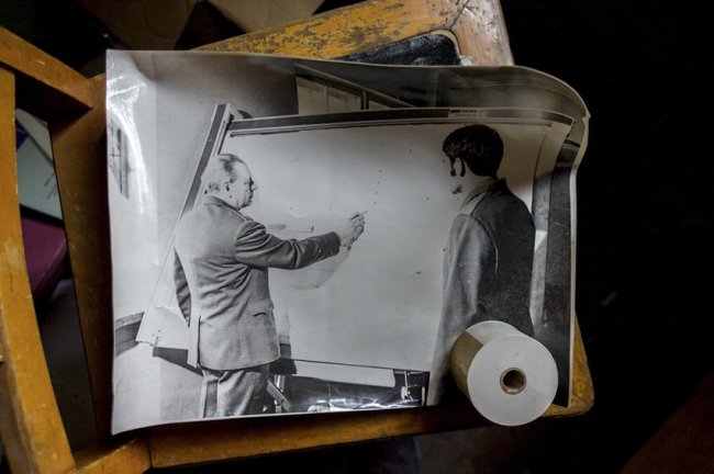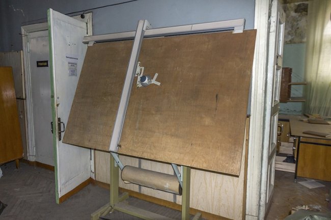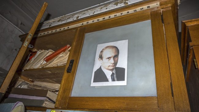 На шкафу с технической документацией попался портрет Путина времён первого срока. Наверное, тогда сотрудники учреждения ещё верили в возрождение армии и оборонной промышленности. Теперь они остались без работы, а гарант дарит свой обнадёживающий взгляд пустоте и разрухе.