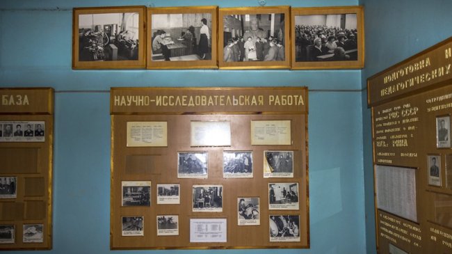 Здесь есть мемориальный зал, украшенный гордыми стендами и фотографиями учреждения.