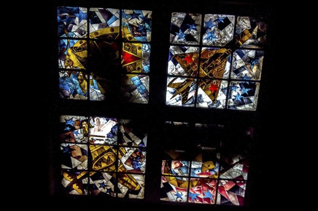 Но главная изюминка зала скрыта в потолке, украшенном огромным цветным витражом.