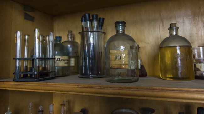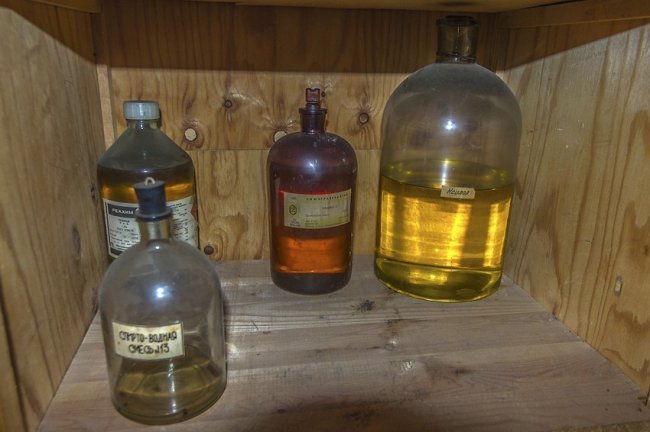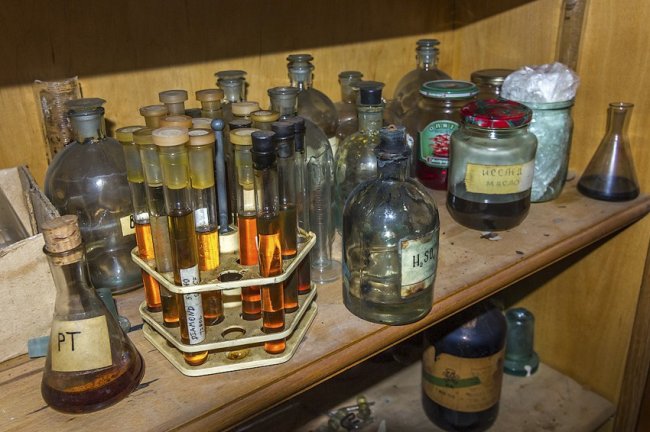 А на этой полке в пробирках и колбочках расставлено авиационное топливо.
