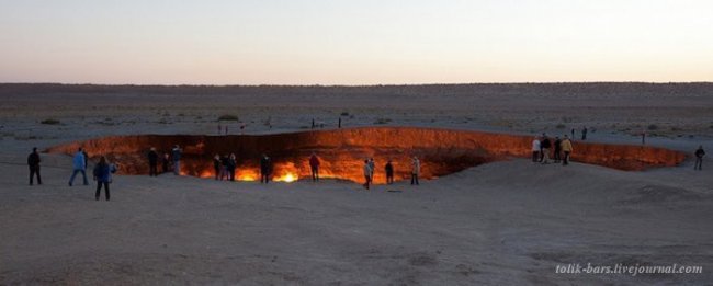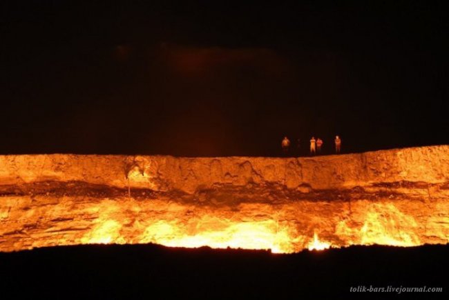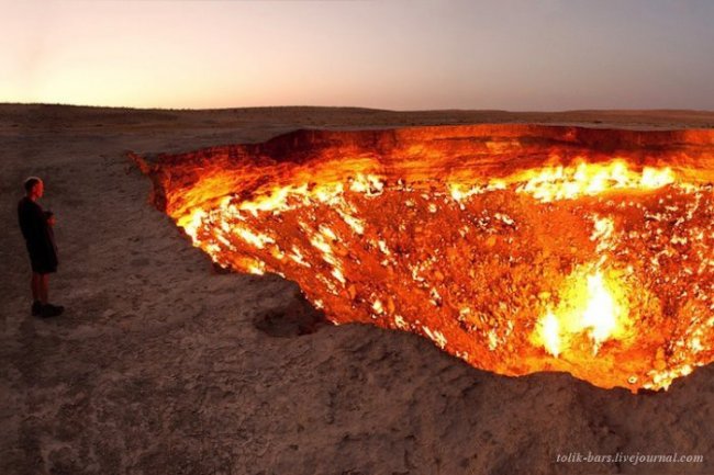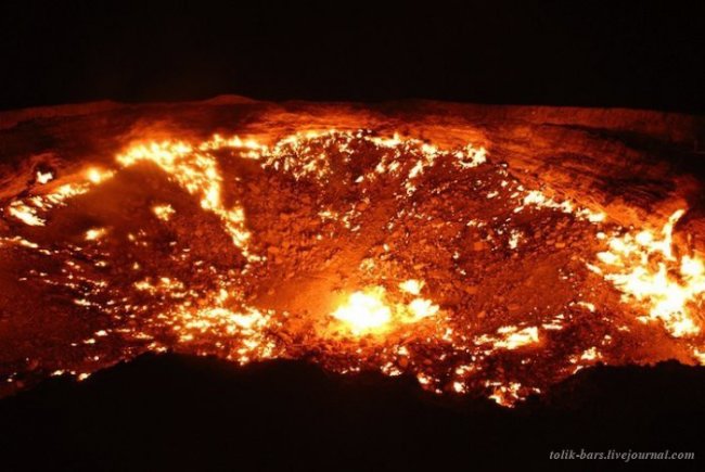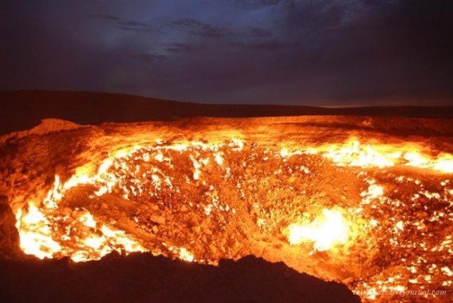 В 1971 году здесь, у деревни Дарваза, Туркмения, советские геологи искали газ и «нашли» подземную каверну, или пустоту. Сквозь землю провалилась и буровая вышка, и остальное оборудование. Но ни один челоек не пострадал.
