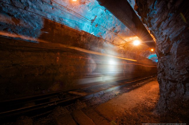 Для отгрузки породы были пробиты длинные туннели непосредственно в нижнюю часть карьера, проложена узкоколейная железная дорога: