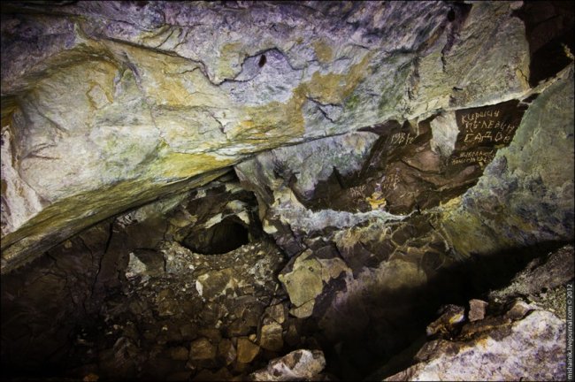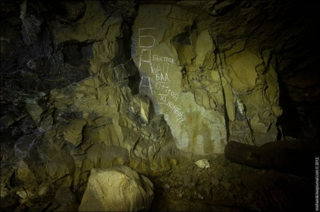 Надписи, сделанные разными людьми в разные времена. Самая ранняя датируется 1976 годом, самая поздняя — 2000 годом. Возможно именно эти люди орудовали здесь в поисках черного металла