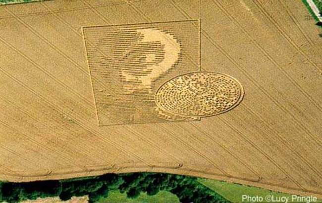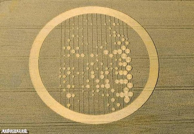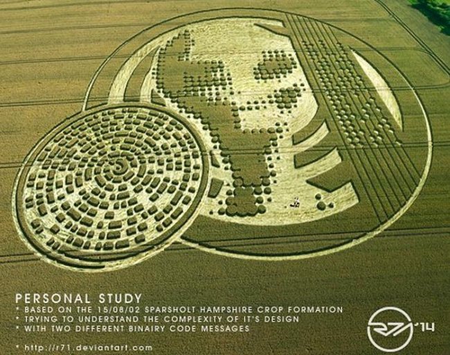 Рисунок 6Сложнейший по технике исполнения рисунок 7, ставший знаменитым, был обнаружен ровно через год 14 августа 2002 года на полях возле обсерватории Чилболтон, графство Гемпшир, Англия. Совершенно очевидно и понятно, что на рисунке изображен портрет гуманоидного существа с большой головой и большими глазами — серокожего карлика (грэйс). Справа от портрета расположено зашифрованное послание в виде компакт-диска. Послание зашифровано в двоичном коде по спирали.