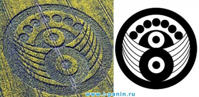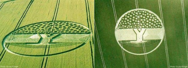 Присмотримся к рисунку на зерновом поле, фотографии его были сделаны в разных ракурсах. Пиктограмма появилась 15 июля 2002 года в графстве Уилтшир, Англия. При поверхностном осмотре многим покажется, что здесь изображено дерево с плодами, которое пустило корни в землю. Если рисунок перевернуть с ног на голову, то он напоминает шляпку гриба с грибницей в подземной части.