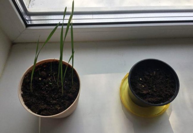 Всхожесть семян Денис зафиксировал с помощью фотографий через одну и две недели после начала эксперимента. В горшочке справа были зёрна из геоглифа, а в левом — обычные зёрна с поля.