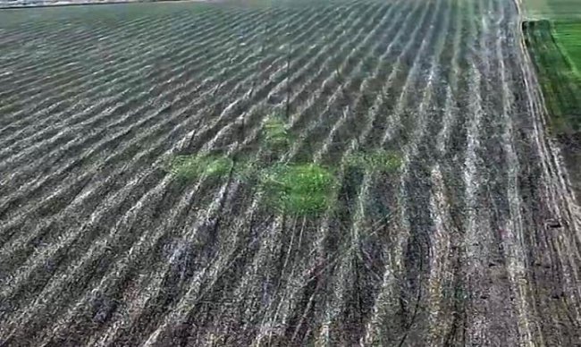 Открытие было сделано случайно, нам подфартило. Мой товарищ Виктор Отчалко вчера поехал в город Краснодар по трассе Ростов-Баку и, проезжая мимо места, где летом был обнаружен феномен, бросил взгляд в ту сторону. Виктор сразу заметил явно выделяющиеся зелёным цветом участки на фоне вспаханного поля. Каково же было его удивление, когда он понял, что они расположены точно на месте июньской пиктограммы. Конечно же, Виктор срочно позвонил мне, предложил сделать выезд для обследования территории и зафиксировать увиденное.