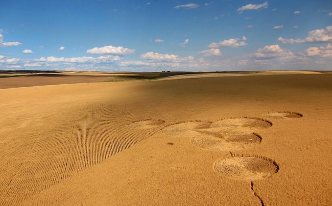 Ростки пшеницы на поле были сильно помяты, но не полностью, а лишь местами. Издали они были похожи на идеально круглые пятна. Я не сумел найти никакого внятного объяснения правильной геометрической форме этих участков. Можно лишь предположить, что здесь поработал какой-то странный вихрь.