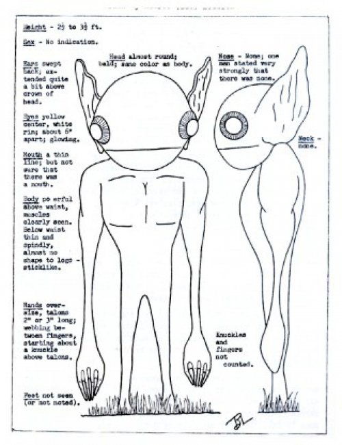 Мужчины решили самостоятельно проверить, что ходит под окнами, но уже толпой. Прихватив с собой ружья, они вышли на улицу, после чего остолбенели от увиденного. Перед ними стояло неизвестное существо с устрашающей вещностью, отдаленно напоминающее человека. Его рост не превышал метра, тело было безволосым и слабо светилось, большую голову украшали огромные уши заостренной формы. Особенно выразительно смотрелись глаза пришельца – желтые, большие, с темно-зелеными зрачками. Его конечности были тонкими, длинные пальцы заканчивались неким подобием ногтей.