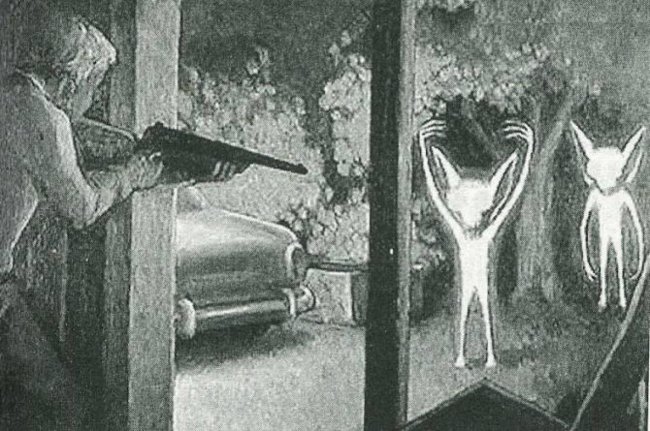 Существо двинулось навстречу мужчинам, на что те ответили бегством. Только возле самой двери они вспомнили о винтовках, которые носили в руках, и начали стрелять в пришельца. Несколько пуль попало в него, но они не причинили ему вреда, а только отбросили, после чего пришелец побежал в сторону своего корабля.
