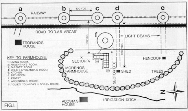 Сеньора не успела далеко уйти. При звуке закрывающейся калитки люди на рельсах сразу обратили внимание на фермерский дом. А уже в следующий момент объект, похожий на тарелку около семи метров в диаметре, начал пикировать на сеньору Морено. Испуганная женщина с криком бросилась к ранчо, а все домашние в ужасе наблюдали, как пылающий диск завис над верхушками деревьев и направил на дом яркий луч света.