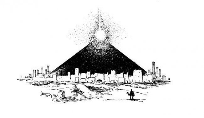 На самой вершине четвертой пирамиды находился колоссальный кубообразный камень, который, возможно, выполнял некогда роль пьедестала. Впрочем, датчанин не был уверен в этом и вполне допускал, что этот камень мог быть самодостаточным изваянием. Сама пирамида была выполнена из некоего подобия черного гранита, но в качестве строительного материала для ее вершины, подпирающей загадочный куб, выступал камень более светлого, желтоватого оттенка. Черная Великая пирамида располагалась к западу от трех других и образовывала вместе с ними прямую линию.