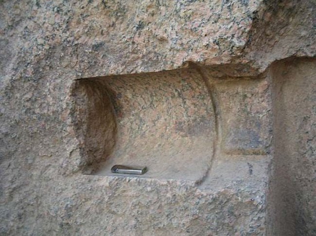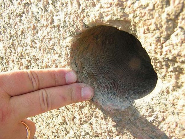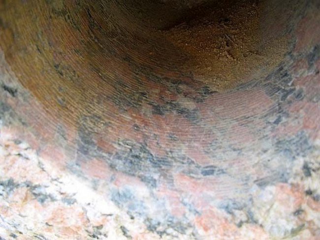 Также во множестве встречаются ровные и глубокие отверстия в заготовке и массиве гранита вокруг неё.
