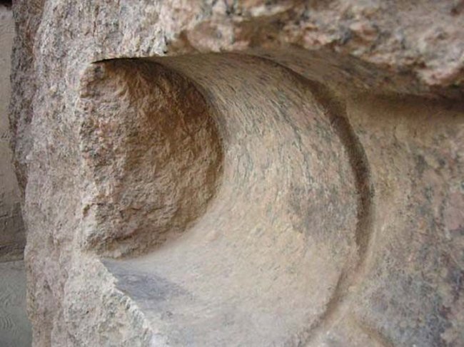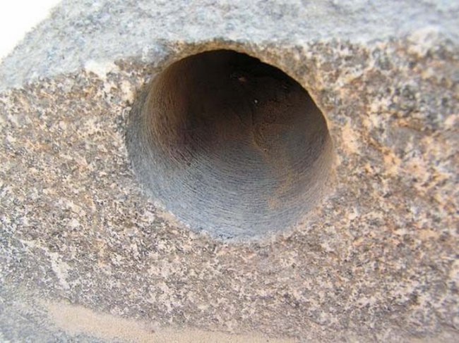 Храм Сахура. Отверстие с круговыми рисками, идущими с одинаковым шагом. Подобные отверсия возможно изготовить медным трубчатым сверлом с применением порошка корунда и подачей воды. Вращение инструмента возможно обеспечить при помощи плоско-ременного привода от варащающегося маховика