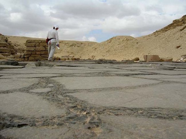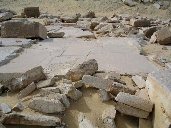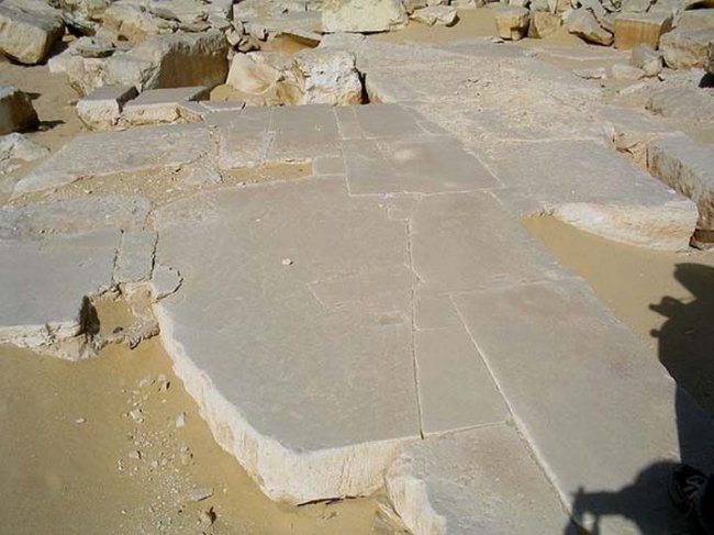 Пирамида Джедкара. Выровненый пол из базальта, технология неизвестна, как впрочем и инструмент, которым эта работа могла быть выполненна. Обратите внимание на бортик справа. Возможно инструмент не был доведен до края по неизвестной причине