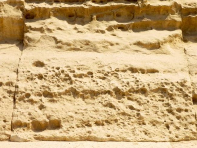 На Сфинксе, храме Сфинкса и первых 20 слоях пирамиды Хеопса наблюдается особенно сильная эрозия. На блоках храма присутствуют наносы, которые обычно наблюдаются в лагунах и мелких морях.