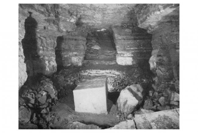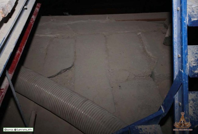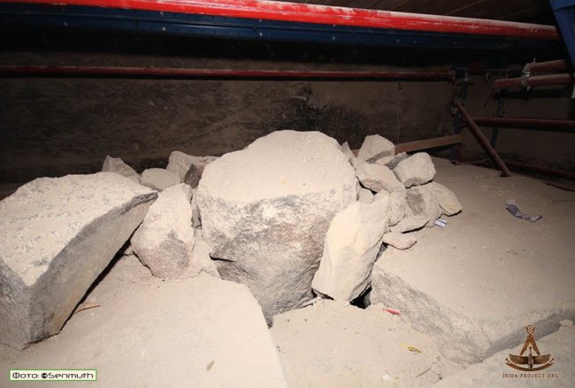 Камень упавший сверху до сих пор торчит в «ране» саркофага.