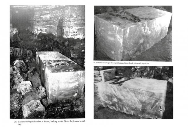 Саркофаг из базальта. Крышка не сдвинута, но кусок аж выломали, чтобы добраться до содержимого.