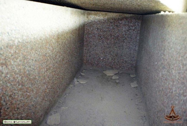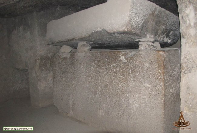 Внутри ведутся реставрационные работы, и сам саркофаг находится в окружении строительных лесов (тут скорее не леса, а конструкция для спуска вниз). Саркофаг не монолитный, как все прочие, а сложен из гранитных балок; по своим размерам (примерно 4х4 м) больше походит на склеп. Найти полное описание до сих пор не удается, но это вопрос времени, ведь все-таки пирамида и ее комплекс хорошо изучены.