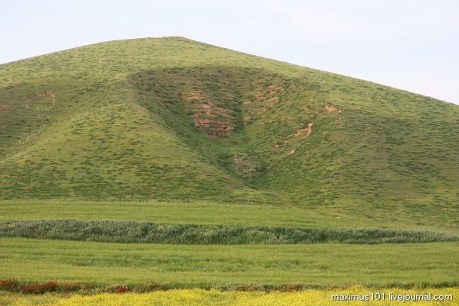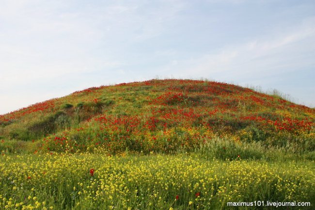Этот курган на фото весь в красных маках, а за ним, вдалеке, виднеется главная цель моего похода — курган Алиатта, кажется, что до него рукой подать, но на самом деле, туда идти и идти по целине, просто он из-за своих размеров сильно нарушает перспективу.