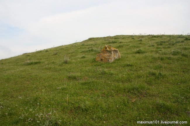 Издалека видно нагромождение крупных каменных блоков у подошвы кургана, возможно это начало дромоса, уходящего вглубь. Большой курган в этой паре имеет приличный размеры — диаметр 90 метров, высота минимум 15 метров, такой размер имело большинство царских курганов скифов на юге Украины и в Крыму. Но тратить время на эти два холма я не стал, так как было заметно, что они хорошо огорожены колючей проволокой.