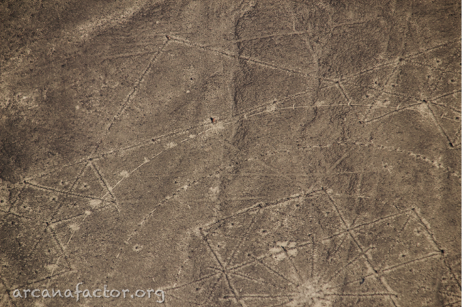 Заинтересовавшись подобным рисунком и найдя его местоположение в пустыне, мы несколько раз облетели это место и детально отсняли этот район. При изучении фотографий и видео, помимо рисунка, показанного в фильме, в этом районе было найдено еще три подобных построения. В целом можно говорить о 8-и таких изображениях, которые хорошо читаются и доступны для изучения. 6 из них представлены на рисунке: