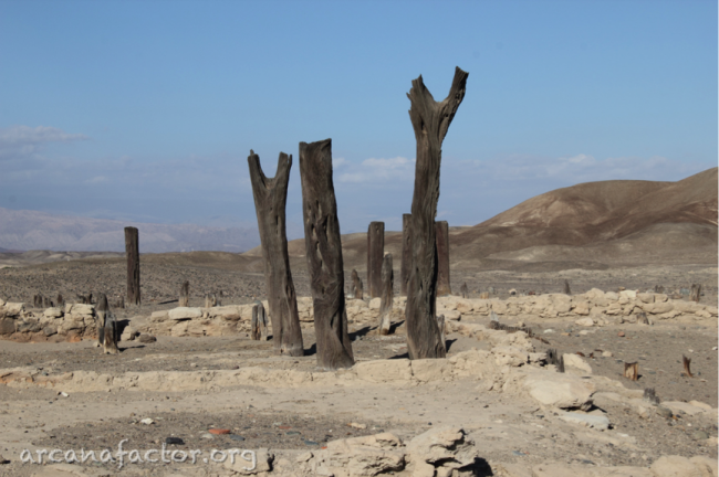 Хорошо видно, что дерево продолжительное время лежало на открытом воздухе – практически все шесты изогнуты, многие сильно трухлявые. Сложно судить о возрасте (углеродный анализ здесь не поможет – материал долгое время находился в контакте с атмосферой). О том, что дерево может в данных метеоусловиях сохраняться тысячелетиями говорит состояние столбов Эстакерии, древнего сооружения, принадлежавшего культуре Наска.