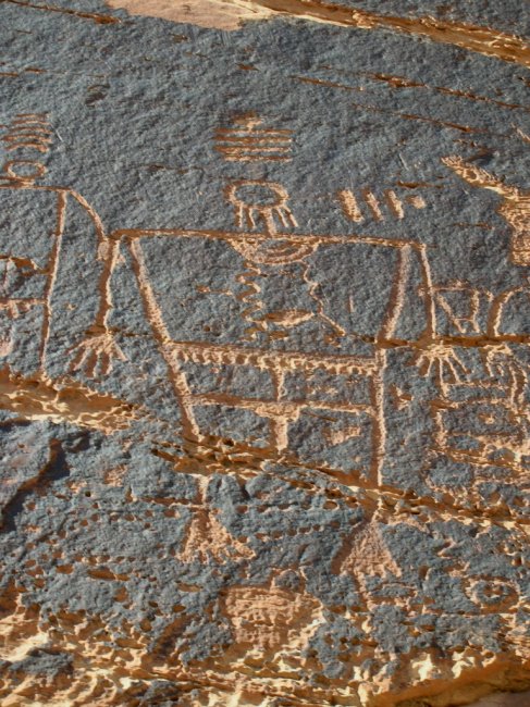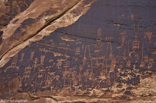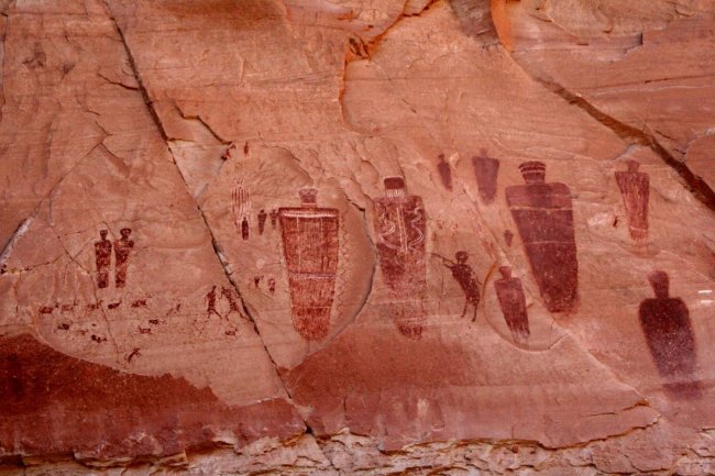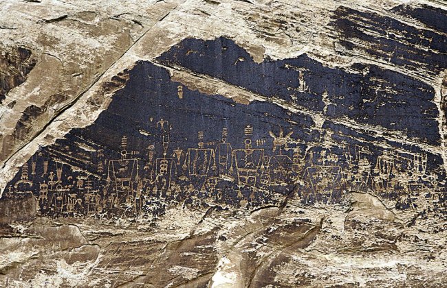 Butler Wash Petroglyph Panel — группа петроглифов рядом с рекой Сан Хуан. В рамках теории палеоконтакта изображает наших древних гостей. Мы видим шлемы, антенны, скафандры и некое подобие свечение вокруг шлемов.