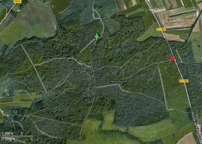 Исследовав местность в радиусе сотни метров от точки с координатами и не обнаружив ни малейшего следа бункера, возвращаемся назад к развилке и на этот раз идем прямо по заросшей и, судя по всему, много лет не используемой грунтовке. Грунтовка упирается в поляну, поросшую высокой травой по пояс и кустами. За поляной продолжается лес, но смысла идти туда я не вижу. Обойдя все в радиусе сотни метров и не обнаружив ничего, возвращаемся обратно к развилке. Помимо навигатора у меня с собой распечатка с Google Maps, привожу ее ниже. Зеленой стрелкой обозначены координаты бункера, где он должен был бы быть, красной точкой я обозначил место стоянки нашей машины. Как оказалось расположение грунтовок в лесу с гугловской карты не соответствует действительности и вскоре мы в этом убедились. Что делать? Решаем пойти по последнему неисследованному пути на развилке — налево, так как стало очевидно, что бункер может быть где угодно в этом лесу.