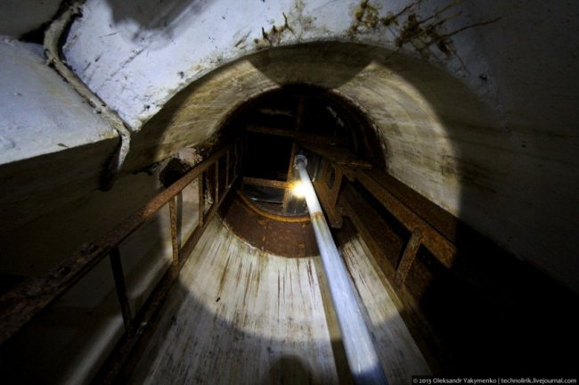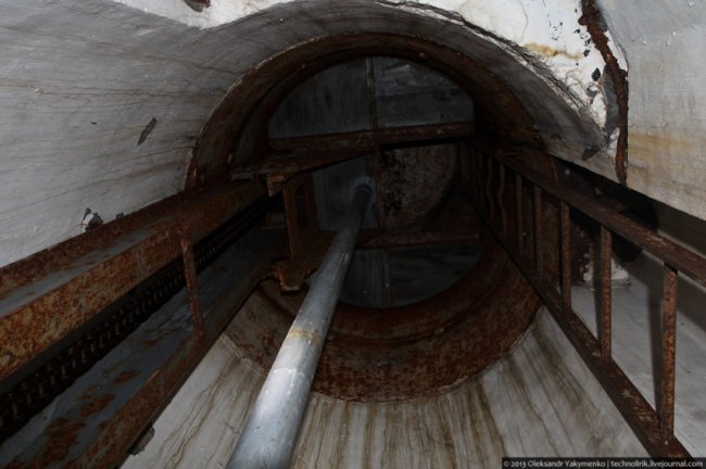На этом фото можно даже рассмотреть площадку внутри бронекупола, которая опускалась с помощью подъемного механизма вниз для загрузки оружия и боеприпасов и затем также поднималась вверх. С помощью системы противовесов подъем и спуск выполнялись одним человеком чисто механически. Я был в таком бронекуполе в другом заброшенном бункере и там эта система полностью работала. Уверен, что она работает и тут, судя по тому, что цепь смазана. Проверять не стал.