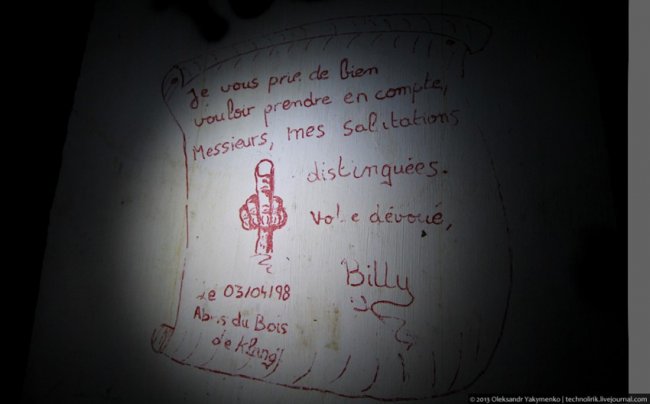 Кто-то из посетивших убежище в прошлые годы, оставил тут свои рисунки — в данном случае нарисованный мелом символ линии Мажино.