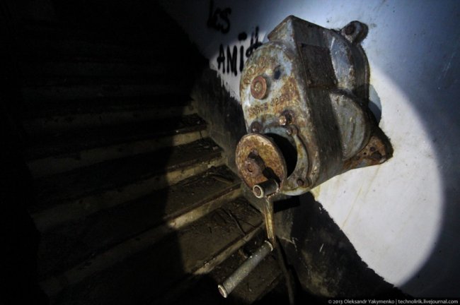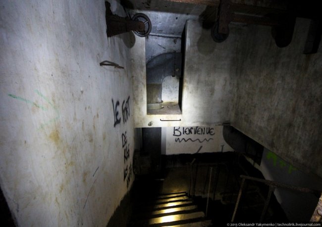 Лестница вниз. Как не прискорбно, но мудаки с баллонами с краской добрались и сюда, оставив продукты своего недалекого ума и кривых рук на стенах. Хотя благодаря труднодоступности это убежище еще слабо пострадало от нашествия гопников с краской. Многие другие покинутые сооружения линии Мажино исписаны и изрисованы вдоль и поперек. В верхней части фотографии видны остатки подъемного механизма, с помощью которого на нижний уровень опускались ящики с провизией и амуницией. Также можно заметить прекрасно сохранившиеся вентиляционные трубы, идущие из фильтро-вентиляционной комнаты на нижний уровень в казарму.