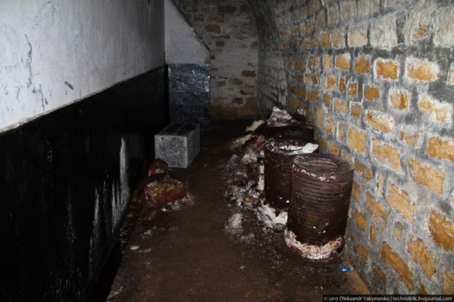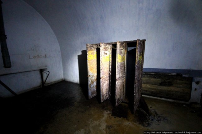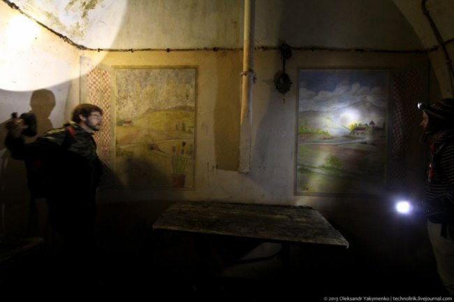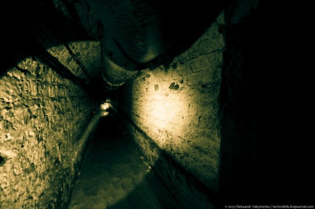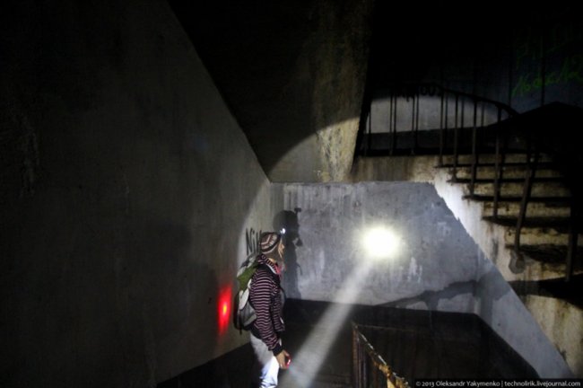 Достаем фонари, и начинаем исследовать этот затерянный мир. На фото вход в убежище. Справа дверь на улицу, через которую мы вошли. Сохранился фонарь у входа и электропроводка к нему.