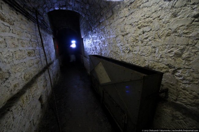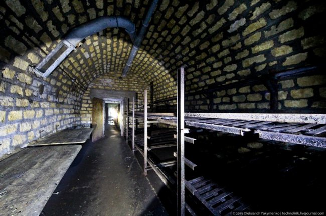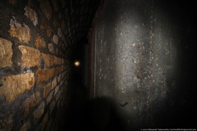 Те, кто был тут до нас, выстроили дорожку из различных предметов, по которым можно добраться до сухой части подземной казармы не намочив ноги, если на ногах обычная обувь. Можно оценить длину одной из трех параллельных потерн — около 200 метров.