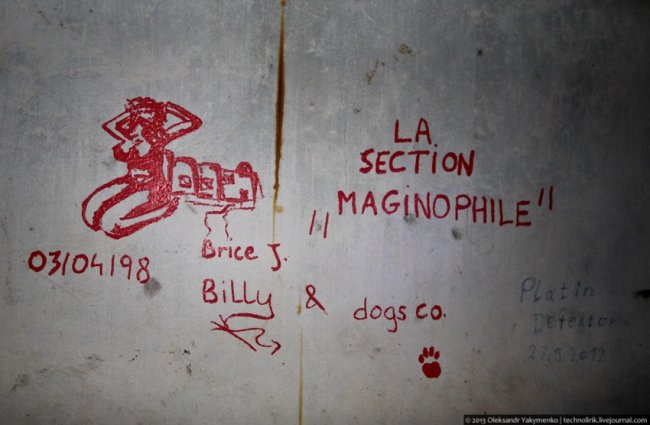В соседнем помещении были обнаружены бочки с какой-то странной химической субстанцией. Скорее всего в бочках хлорная известь для дезинфекции, дезодорации и как противоипритный дегазатор, в случае применения немцами газов. Ну а теперь самое интересное — собственно говоря то, ради чего мы сюда пришли. То, что вы видите на этой фотографии — главная фишка этого убежища и яркий исторический артефакт 1939 — 1940 годов. Он отсылает нас к такому историческому периоду Второй мировой, как «странная война». 3 сентября 1939-го года в связи с нападением Германией на Польшу, Великобритания и Франция объявили Германии войну. Но вплоть до 10 мая 1940-го, когда немцы начали широкомасштабные наступательные действия на территории Бельгии и Голландии, военных действий на Западном фронте практически не велось и это время получило название «Странной войны». Воюющие стороны отсиживались за линиями укреплений: французы за линией Мажино, немцы — за линией Зигфрида. Война на границе Германии и Франции медленно тлела локальными стычками. 1-го сентября 1939-го во Франции была объявлена мобилизация и оборонительные сооружения линии Мажино были заполнены призывниками, главным образом — простыми сельскими парнями, которые вчера еще сеяли хлеб и пасли скот на полях. И этих парней оторвали от их родной земли, от их привычного жизненного уклада и поместили под землю в бункера. Страна находилась в состоянии войны, но войны не было и тысячи молодых парней месяцами томились в тесных подземельях, скучая от безделья и тоскуя в замкнутом пространстве о просторах и красотах родных сельскохозяйственных пейзажей.