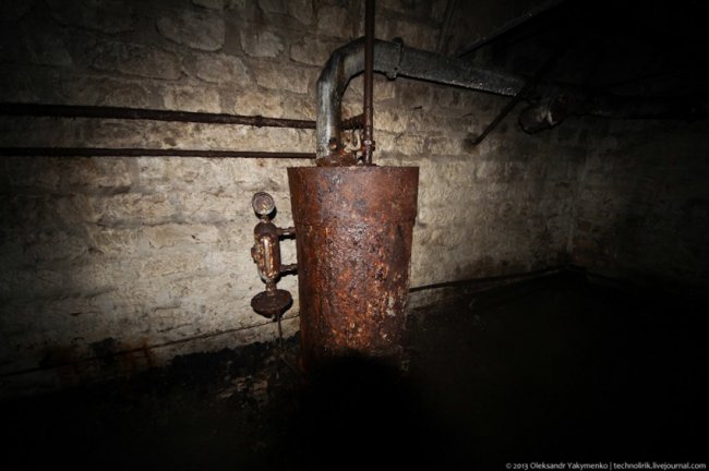 Сфотографировать эту комнату очень трудно так как две огромных цистерны занимают пространство комнаты полностью, оставляя лишь узкие проходы возле самых стен. Тут же расположены колодец и насос, с помощью которого осуществлялась закачка воды в резервуары.