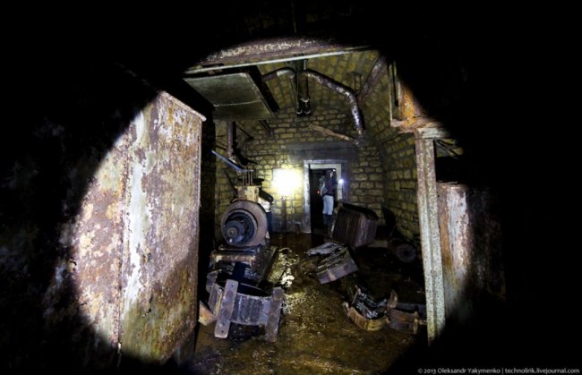 А это машинное отделение с генераторной установкой. Электропитание убежища осуществлялось извне по подземному кабелю, но в случае военных действий кабель мог быть поврежден — на этот случай был предусмотрен резервный дизель-генератор, вырабатывающий электричество исключительно для освещения и вентиляции убежища. Под потолком видны трубы подачи воздуха к дизелю и отвода выхлопных газов.