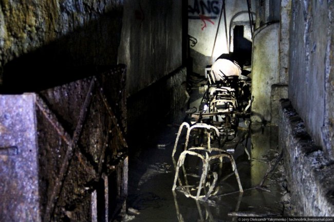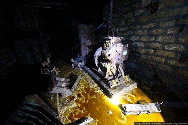 Дизельный двигатель очень маленький — всего один цилиндр. В углу комнаты сохранились топливные резервуары а пол залит смесью воды, машинного масла и грязи. Рядом с остатками двигателя на полу виден статор генератора. На фотографиях этого места, сделанных в начале 2000-х генератор еще в целости и сохранности на своем месте. Я не понимаю, что заставляет людей преодолевать такой путь, спускаться в подземелье и долбить прочный стальной генератор, чтобы достать из него пучок меди, цена которой четыре евро за килограмм. Сколько сил нужно затратить, чтобы получить смешные четыре-пять евро! Бензин обойдется дороже, чем прибыль от такого промысла. Но в каждой стране найдутся дебилы, даже если это богатая и благополучная Франция.