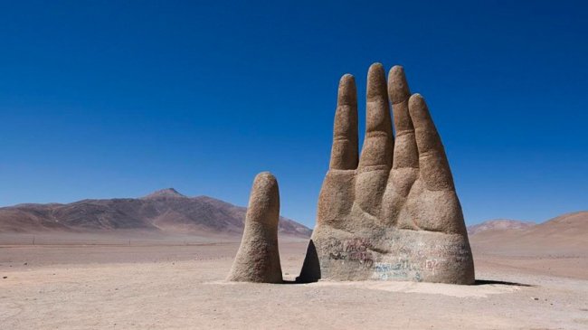 «Рука Пустыни», Атакама, Чили Гигантские пальцы, будто раскапывающие песок пустыни, чтобы позволить выбраться остальному телу (исходя из размера руки, это должен быть настоящий великан), придумал и воплотил в жизнь чилийский скульптор Марио Ираррасабаль. Два похожих монумента за авторством Марио, представляющих собой огромные руки, есть также в США и Уругвае.