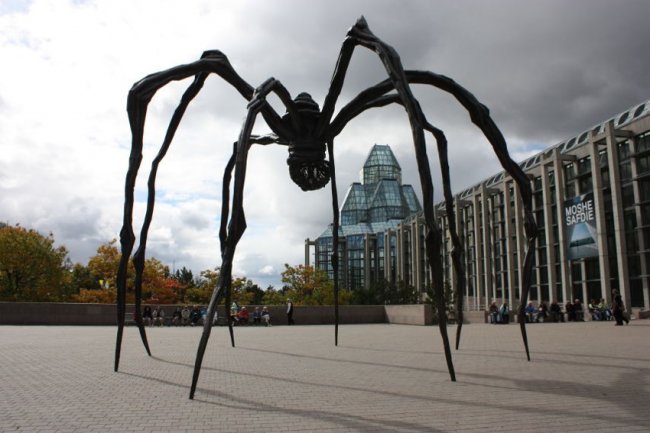 «Мамаша» (фр. «Maman»), Оттава, Онтарио (и не только) Скульптурная композиция за авторством Луизы Буржуа, знаменитого американского скульптора и художницы французского происхождения, состоит из 9-метровой бронзовой паучихи и 26-ти мраморных паучьих яиц. Впервые такой монумент (а их целая серия) появился в 1999-м году в Tate Museum of Modern Art — британской галерее современного искусства. «Эти пауки посвящены моей матери. Мама была ткачихой, наша семья занималась восстановлением и созданием гобеленов. Как и пауки, мама была очень умной, она всегда мне помогала и защищала, как пауки помогают истреблять вредных насекомых. Мать была мне самым лучшим другом», — говорила художница.