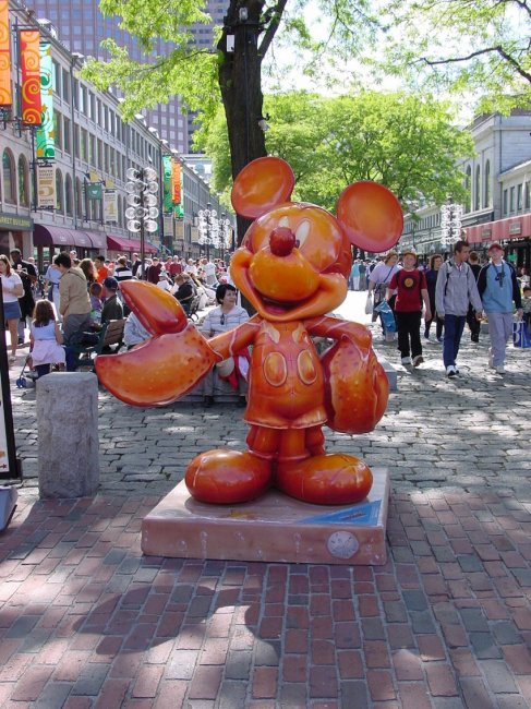 «Омар Микки», Бостон, штат Массачусетс, США Это крайне странное двухметровое творение художницы Бриэны Роулет появилось на свет в рамках проекта, финансируемого «The Walt Disney Company». 75 художников представили своё видение знаменитого персонажа диснеевских мультфильмов Микки Мауса, установив в нескольких городах Соединённых Штатов его изваяния, причём скульптуры должны были отражать характерные особенности того или иного населённого пункта. Вероятно, ничего связанного с Бостоном, кроме морепродуктов, художница вспомнить не смогла, поэтому просто решила объединить Микки Мауса и омаров в единое скульптурное целое.