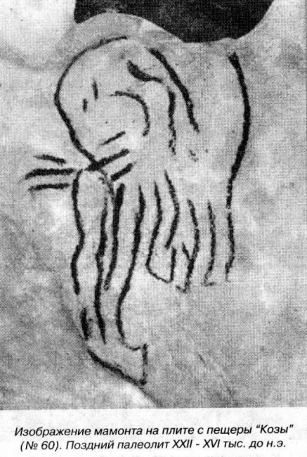 Изображение мамонта или быка в гроте № 9. Эпоха энеолита, конец IV — начало. Ill тыс. до н.э.