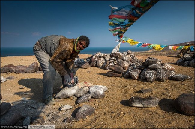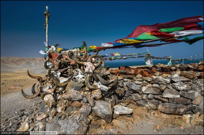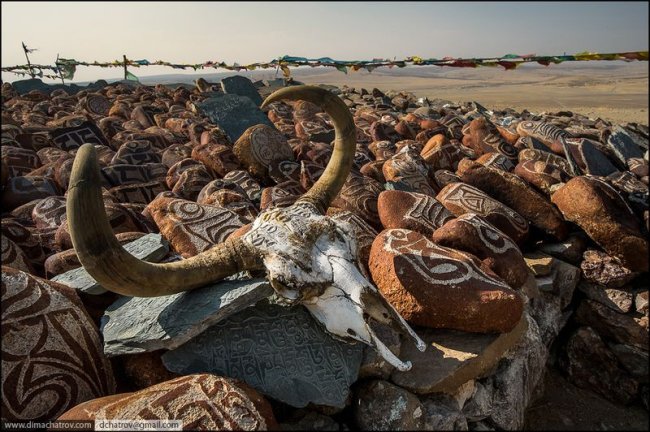 Тибет, высота 4800 метров. Берег священного озера Манасаровар. Это целые поля из черепов и молитвенных камней, уходящие вдаль на десятки и сотни метров. Их возраст неизвестен; несколько месяцев или сотня лет — здесь время ощущается по-иному.