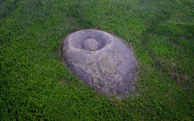 В 1949 году геолог Вадим Колпаков обнаружил большой конус из известняковых глыб на севере Иркутской области в 360 км от районного центра г. Бодайбо. Конус имел любопытную и даже забавную форму: его вершину венчает кратер, в центре которого высится горка высотой около 12 метров. Высота же всей насыпи составляет около 40 метров, ширина 100 метров у основания, а диаметр по гребню – 76 метров. Кратер решено было назвать Патомским по имени близлежащей реки, но местные жители называют его «Гнездом огненного орла».